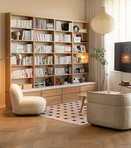 Système de bibliothèque intégré en bois massif Rangement mural complet avec banquettes et tiroirs Armoire personnalisée